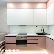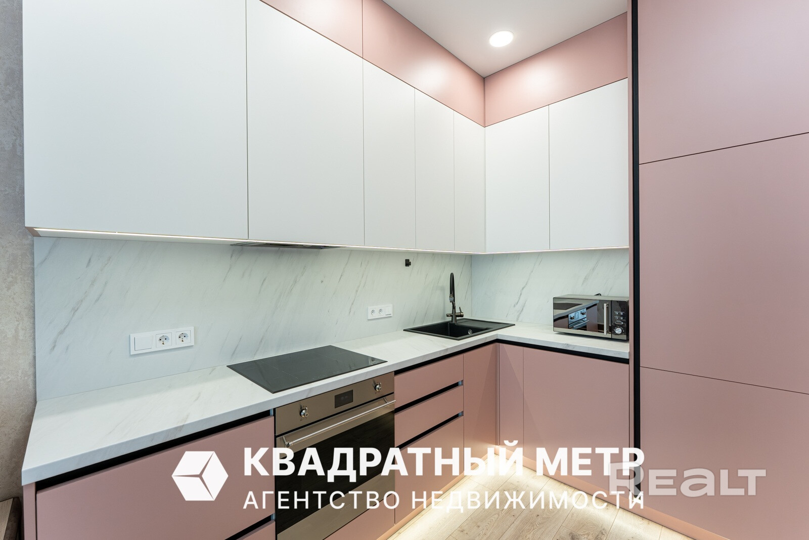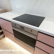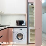 Стильная кухня с матовыми фасадами как будто парит над землей благодаря цоколю с подсветкой, и полностью укомплектована бытовой техникой SMEG, Италия: встроеннный холодильник, стиральная машина, индукционная плита, духовой шкаф, встроенная вытяжка, микроволновая печь). Кухня сделана до потолка, и располагает огромным количеством мест хранения)