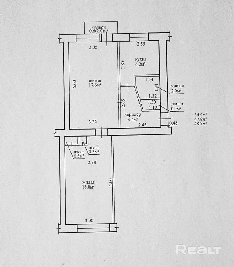 Площадь по СНБ 48,5 м2. Общая площадь: 47,9 м2.