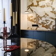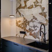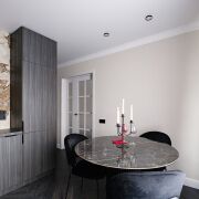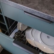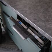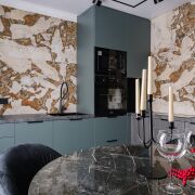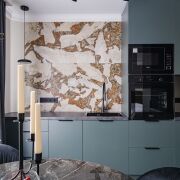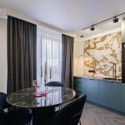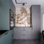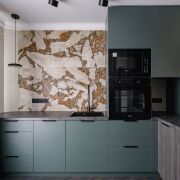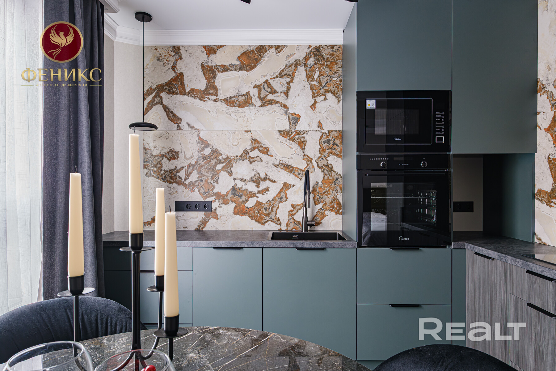Кухня оснащена современной бытовой встроенной техникой (посудомоечная машина, индукционная плита, встроенная печь СВЧ, духовой шкаф, холодильник).