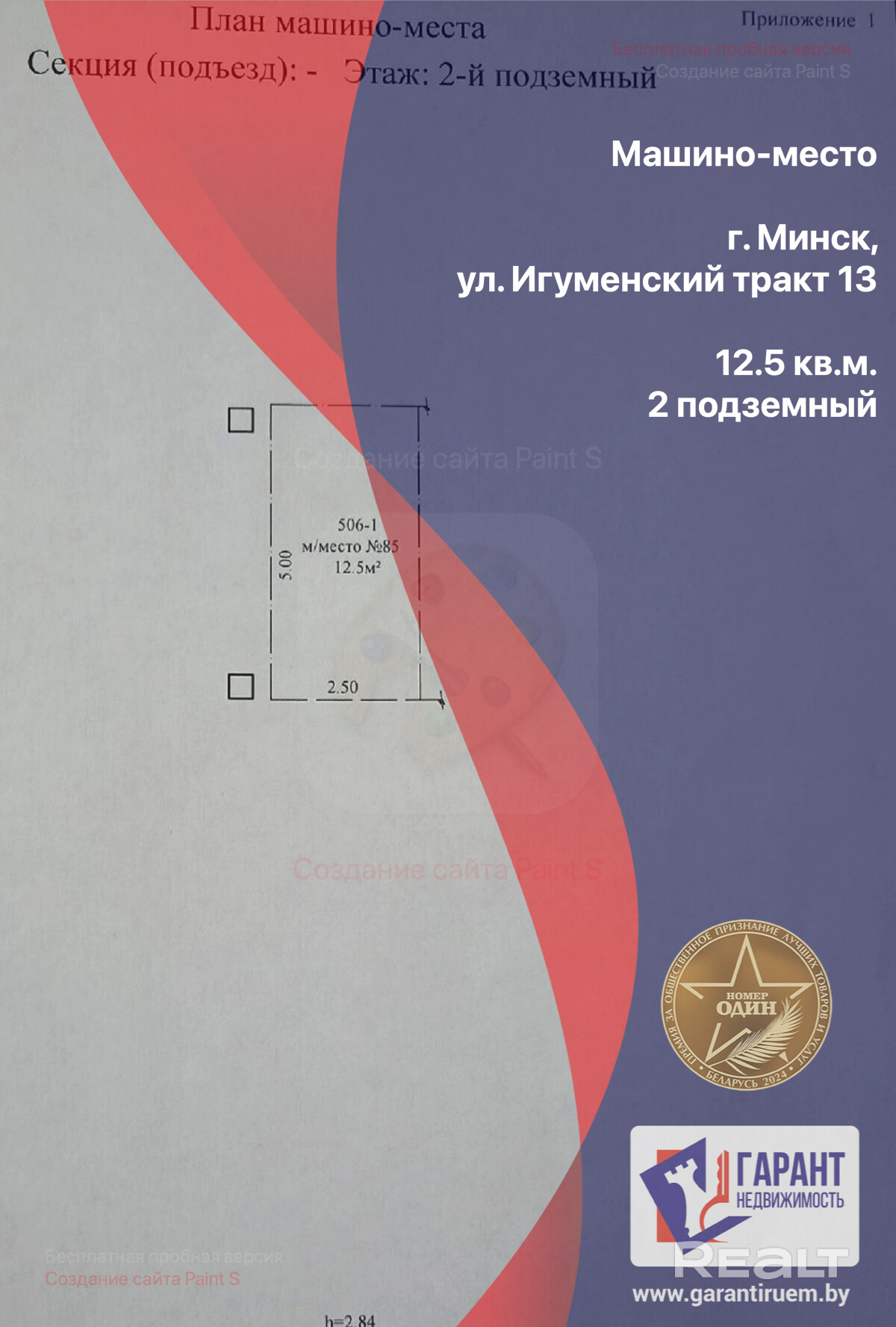 Общая площадь 12.5 кв.м, Находится в новом подземном паркинге. Рядом с парковочным местом находится лифт.