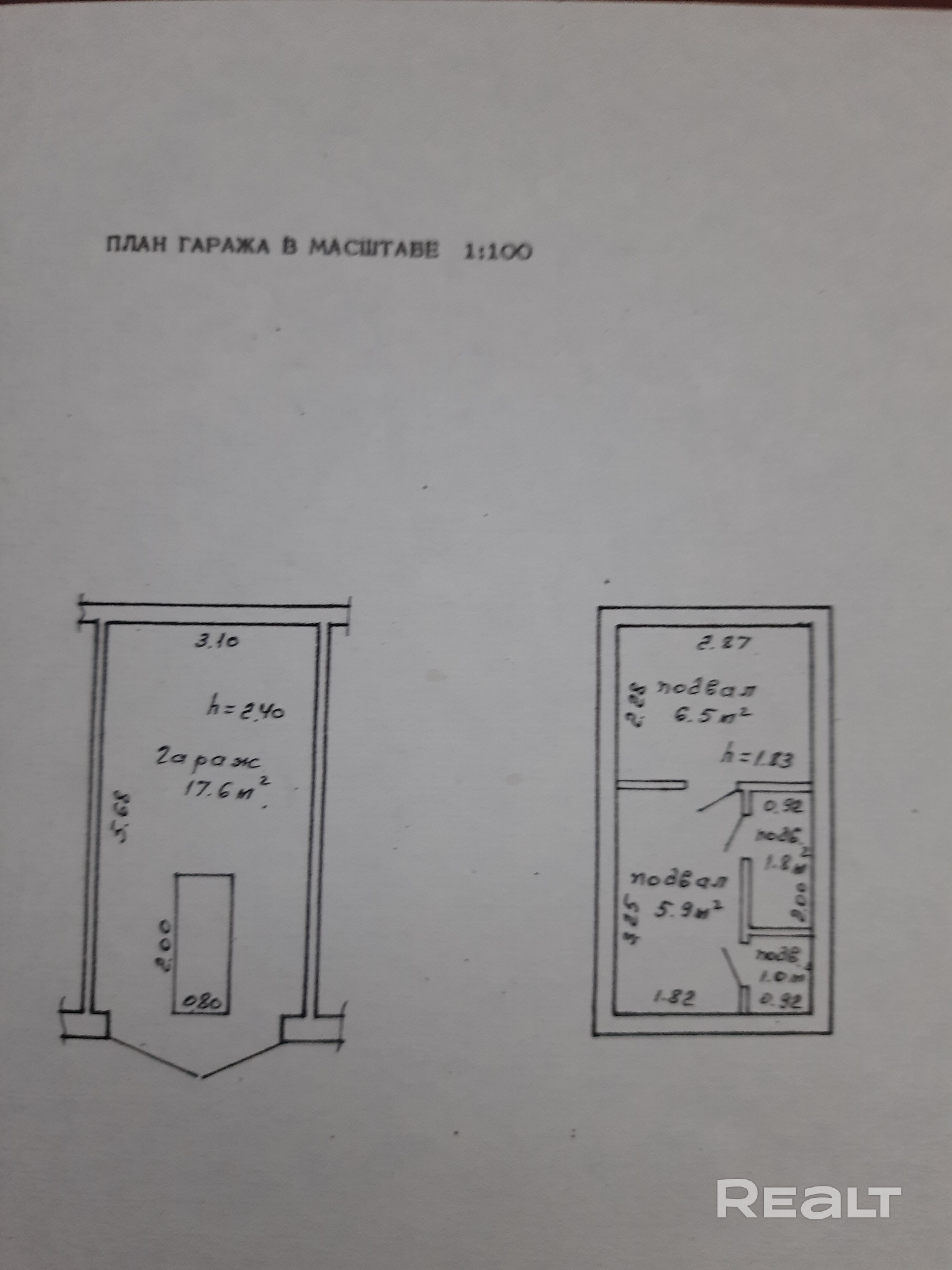 Подвальное помещение располагается по периметру гаража. Потолок утеплён, стены обшиты доской. Перекрытие между гаражом и подвалом также утеплено. Подвал оштукатурен, пол — бетонный