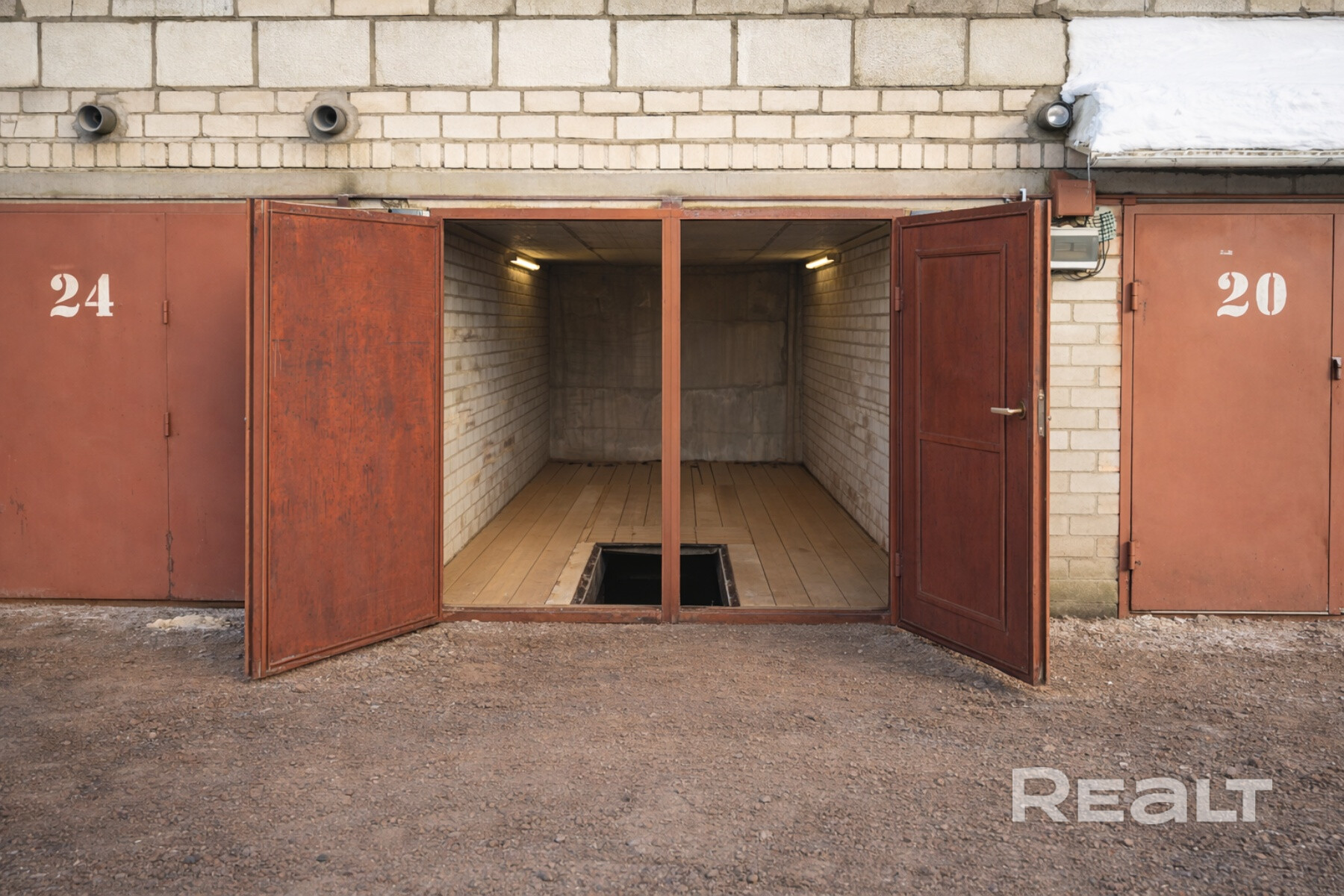 Фундамент – фундаментные блоки, стены – кирпич, перекрытия – железобетон. Полы – бетонная стяжка. Металлические ворота. Распределительный щит внутри помещения.