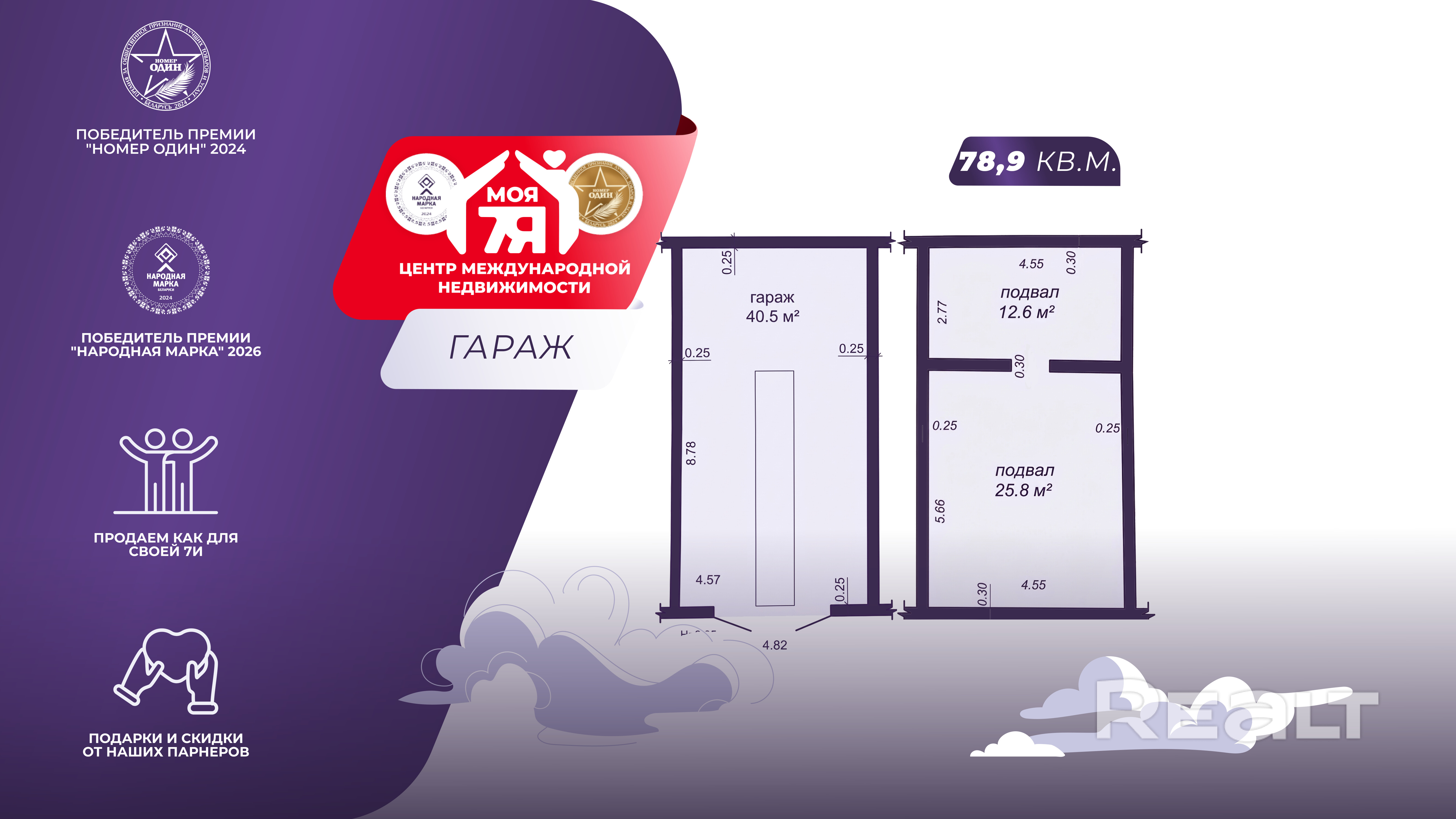-Общая площадь всех помещений (гараж + два подвала) составляет 78,9 квадратных метров – это обширное пространство, позволяющее реализовать различные проекты и идеи.