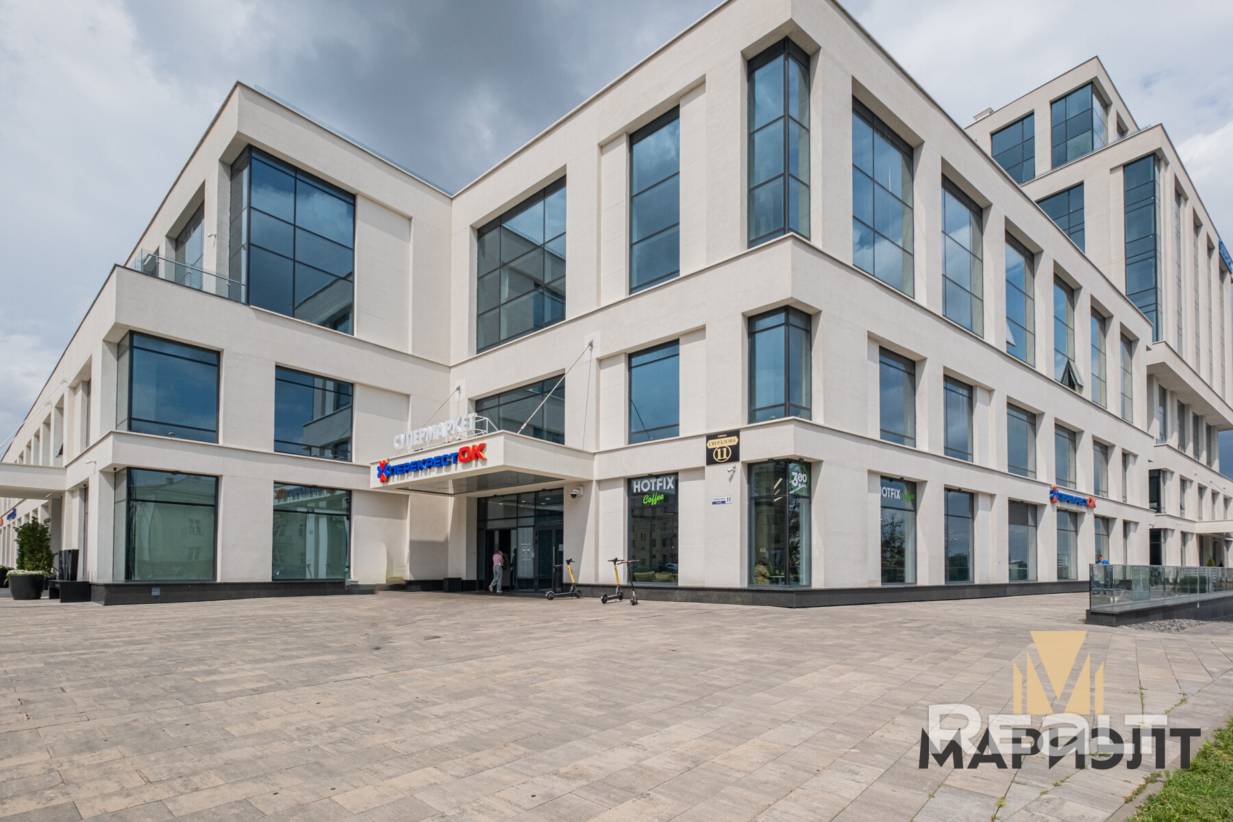В самом здании есть кафе, банк, банкомат, кофепоинт.