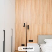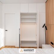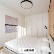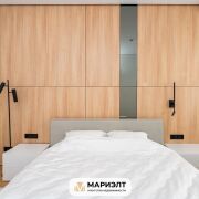 Спальная комната выполнена в светлых тонах.