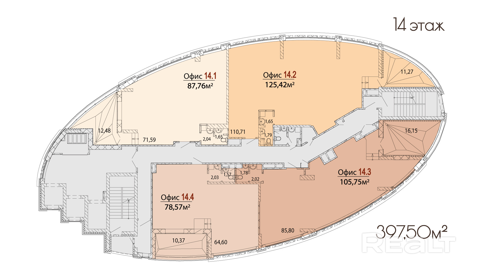 На типовых этажах по 6 офисов площадью от 40м2, на 14-15 этажах по 4 офисных пентхауса 54-110 м2 с террасами 7-17 м2