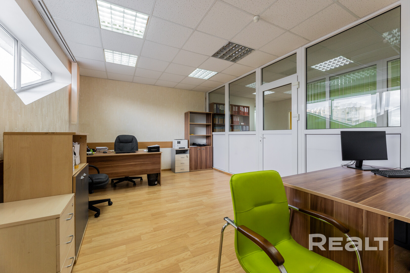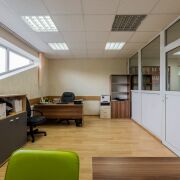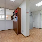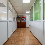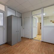 Здание 2003 года постройки, 4-хэтажное, стены из кирпича и керамзитобетонных блоков, что обеспечивает отличную тепло- и шумоизоляцию, перекрытия железобетонные плиты. Пол – плитка и ламинат, потолок подвесной, входная дверь металлическая, на стенах светлые обои. Пространство разделено на 5 раздельных помещений перегородками ПВХ + стекло, где могут с удобством расположится ваши сотрудники. Есть 2 входа, что может быть удобно. Рядом бесплатная парковка.