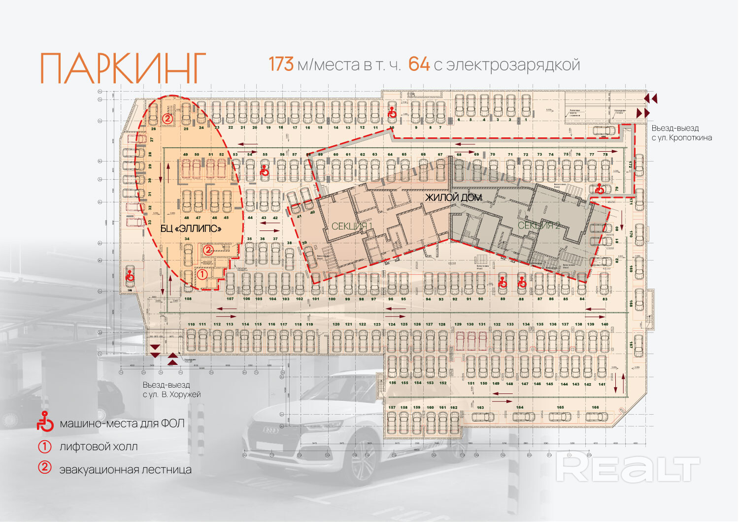 - подземный паркинг с панорамными лифтами на 173 м/м, в т.ч. с электрозарядками