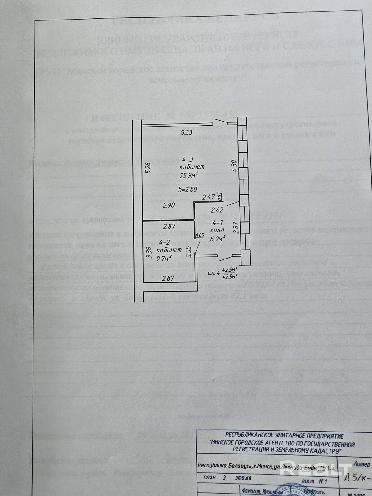 Офис расположен на 3 этаже 5этажного здания, общая площадь 42,5 квадратных метра.