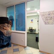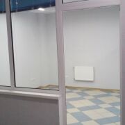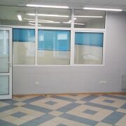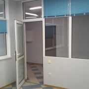 В помещении на полу - плитка, в двух комнатах поверх плитки арендаторы положили ковролин, стеклянные перегородки между комнатами.