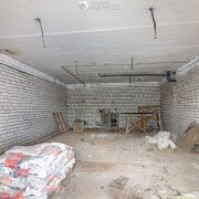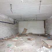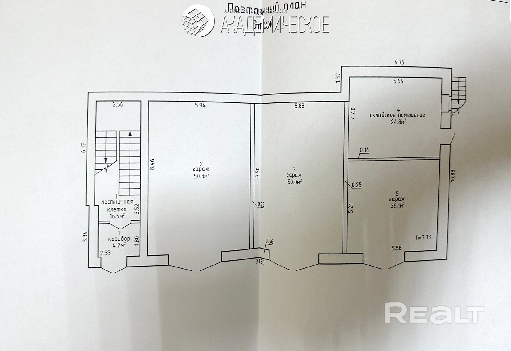 Первый этаж: три бокса гаражей 50.3м2/50м2/29.1м2 и склад 24.8м2, возможность вычленения этой группы помещений и формирование единого изолированного помещения под автомобильный сервис. Высота внутри 3.03 метра.