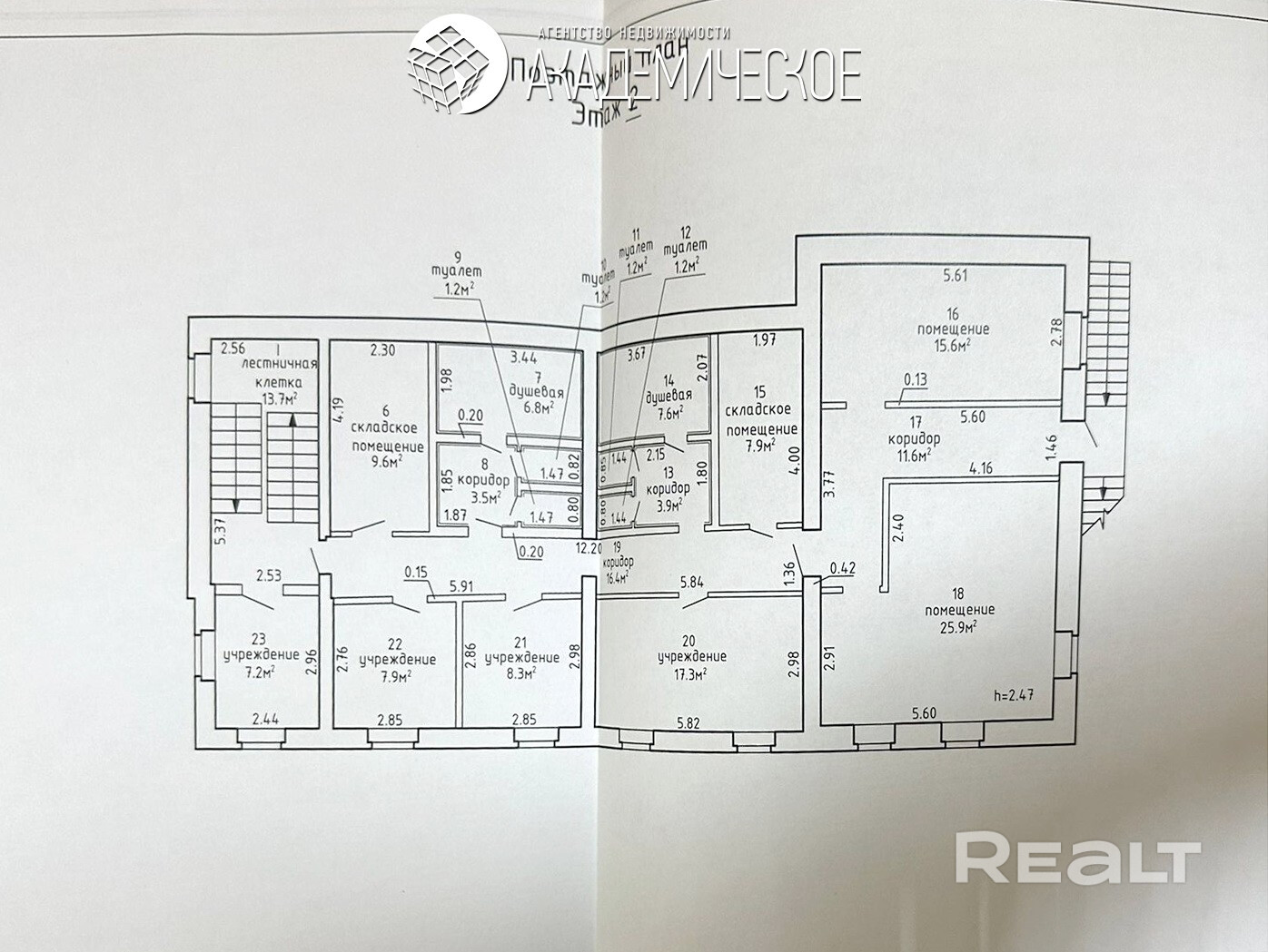 Второй этаж: помещения общей площадью 82.2м2, коридор, два склада, санитарные помещения. Площадь помещений второго этажа – 154м2.