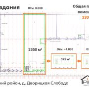 ○ уровень +4.800 — 375 кв. м (мезонин над загрузочно-разгрузочной зоной);
