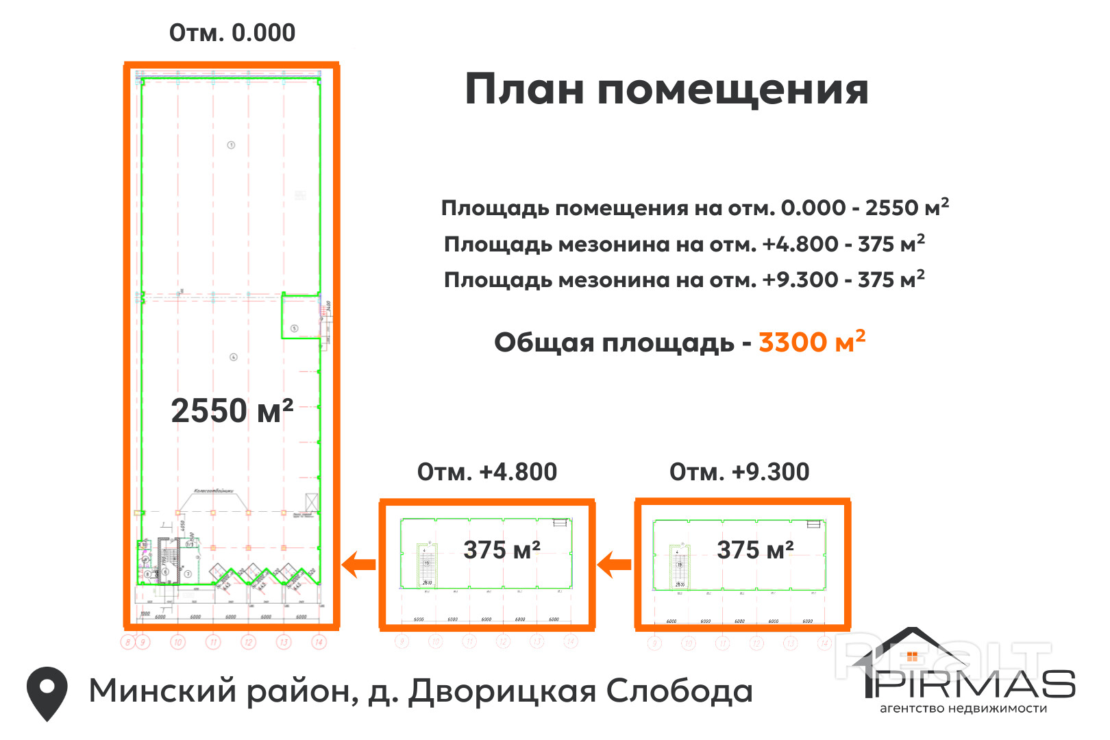 ○ уровень +9.300 — 375 кв. м (второй мезонин над загрузочно-разгрузочной зоной);