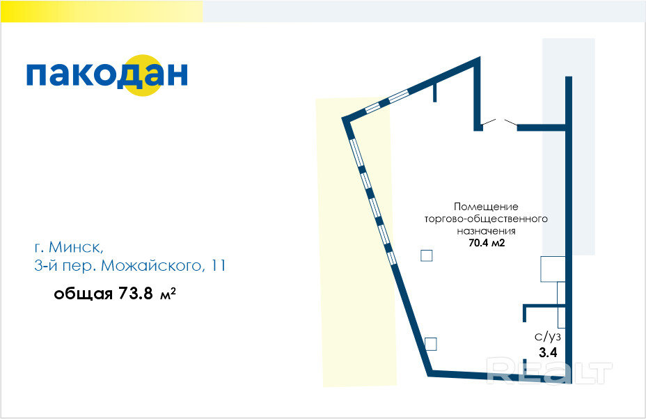Многофункциональный метраж помещения (73.8 м2) , а также грамотное зонирование подойдет для реализации любых Ваших коммерческих целей.