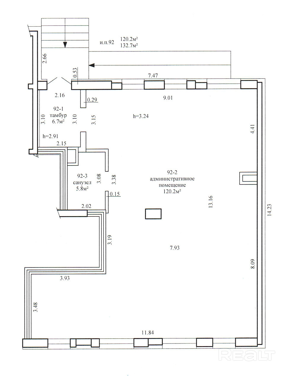 Высокие потолки (3,25 м), у входа в помещение есть пандус, что обеспечивает безбарьерную среду.