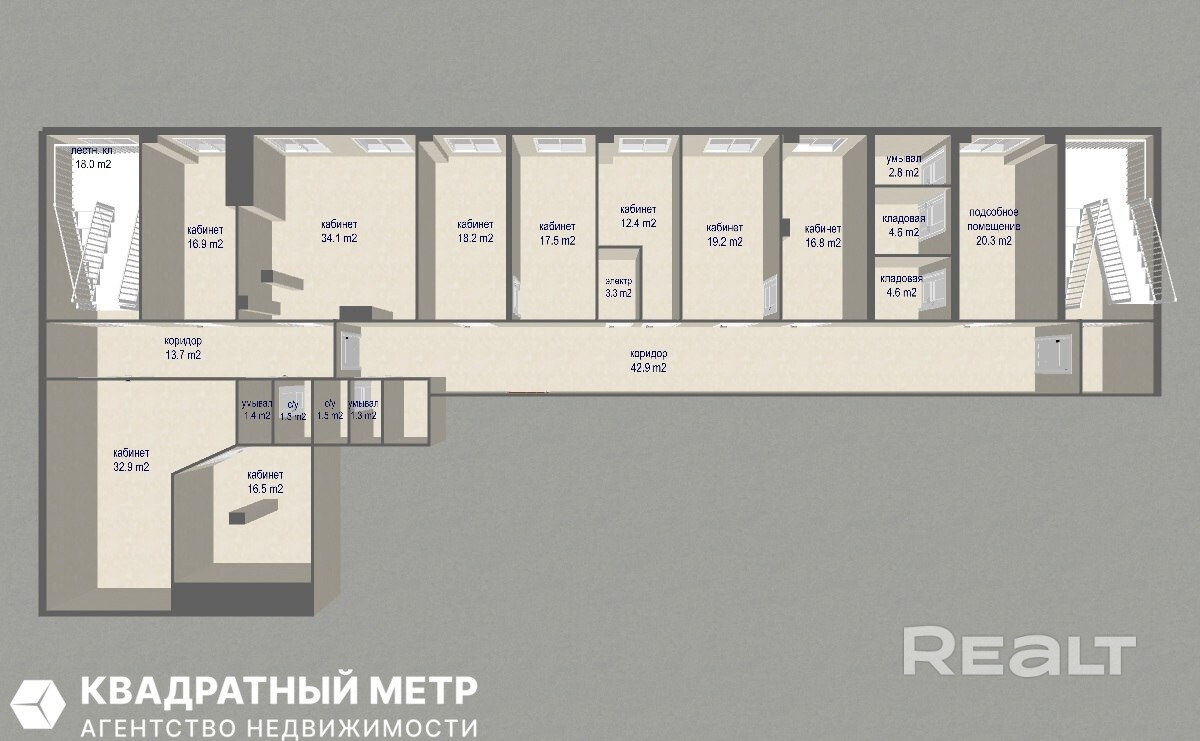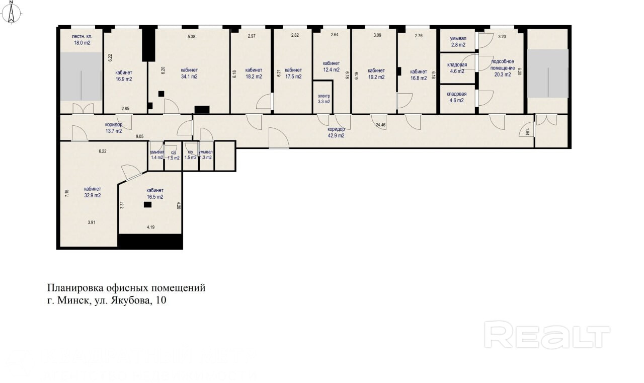 - Внутренняя инфраструктура: 9 офисов, 2 санузла, 3 кладовые, 1 подсобное помещение.