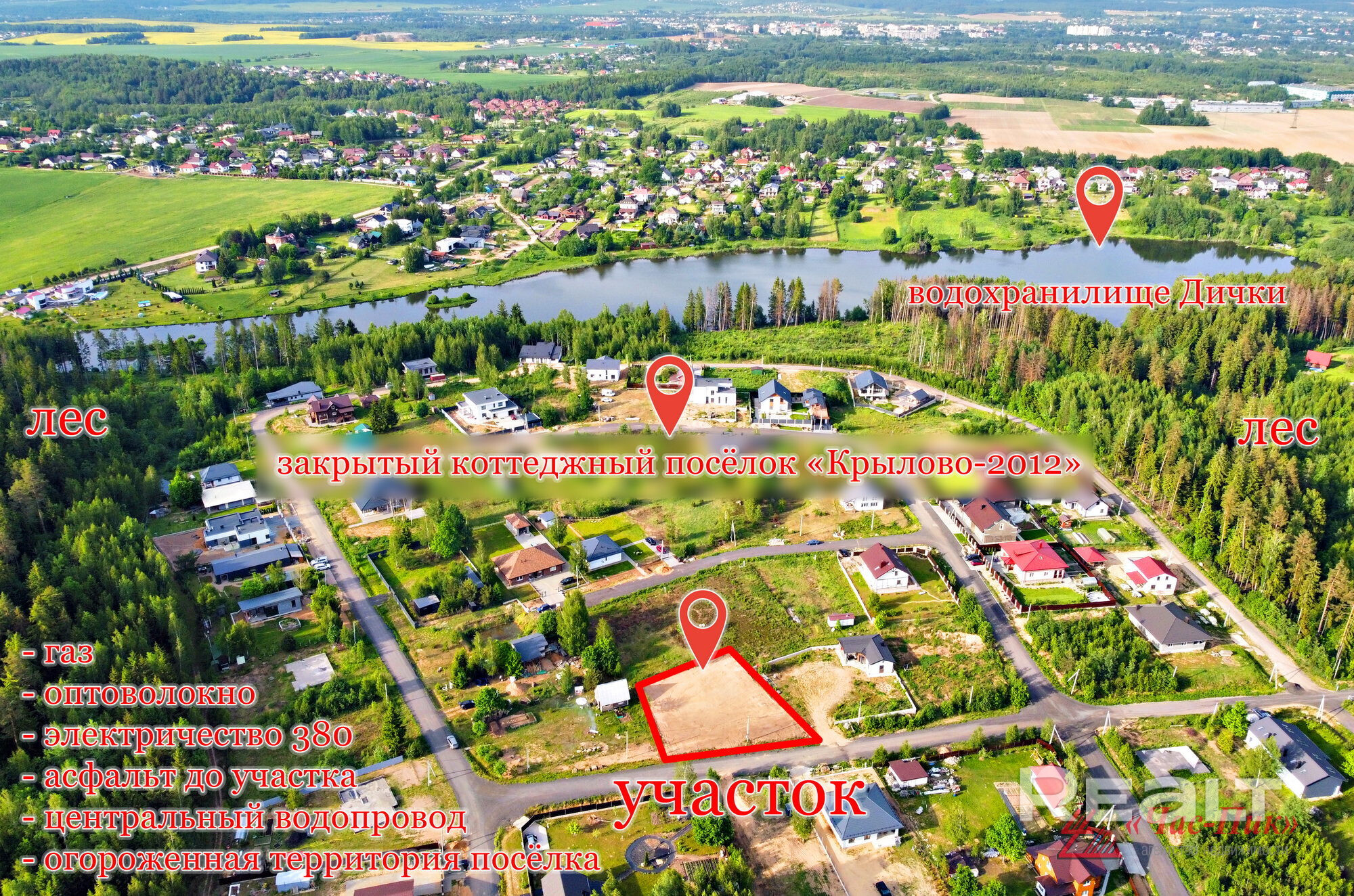 Продаётся престижный земельный участок 10 соток премиум-класса вблизи водохранилища «Дички» в закрытом коттеджном посёлке «Крылово-2012» (д.Дички), Минский район, 15 км от Минска (15 минут от станции метро `Каменная Горка` и пр.Победителей); асфальт до участка; все коммуникации на участке - свет 380, газ, центральный водопровод, оптоволокно; вокруг застройки лесной массив; новый современный закрытый коттеджный посёлок, подведены коммуникации, охраняемая огороженная территория с видеонаблюдением; удобный круглогодичный подъезд как со стороны Раковского так и Молодеченского направления; очистка дорог от снега зимой; чистейший воздух, грибы, ягоды, рыбалка, купание; отличное место для строительства уютного загородного дома; приглашаем на осмотр; торг!