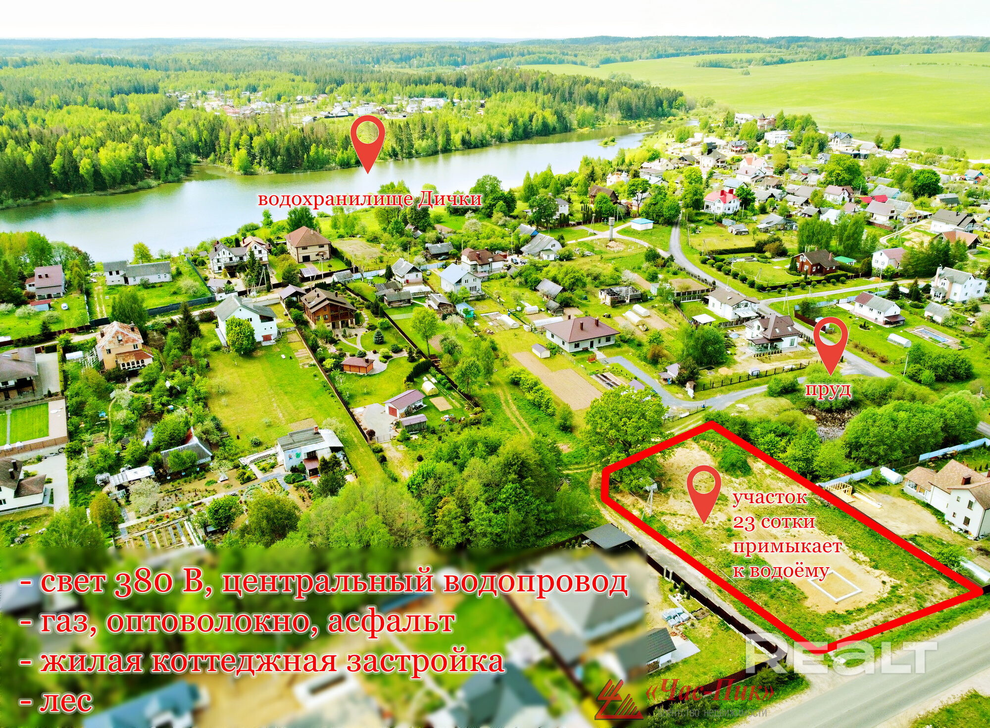 Продаётся эксклюзивный земельный участок 23 соток премиум-класса примыкающий к водоёму у водохранилища «Дички» в престижном коттеджном посёлке д.Дички, Минский район, 15 км от Минска (15 минут от станции метро `Каменная Горка` и пр.Победителей); асфальт до участка; все коммуникации - свет 380-15 квт, газ, центральный водопровод, оптоволокно; вокруг застройки лесной массив; новый современный закрытый коттеджный посёлок; удобный круглогодичный подъезд как со стороны Раковского так и Молодеченского направления; очистка дорог от снега зимой; чистейший воздух, грибы, ягоды, рыбалка, купание; отличное место для строительства уютного загородного дома; приглашаем на осмотр; торг!