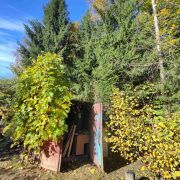 С четырех сторон участок огражден сеткой рабицей. Круглый год хорошие подъездные пути, зимой дороги системно чистятся. Многие соседи живут круглогодично. С участка открывается вид на сосновый лес. На участке размещены стройматериалы, металлический вагончик для хранения инвентаря.