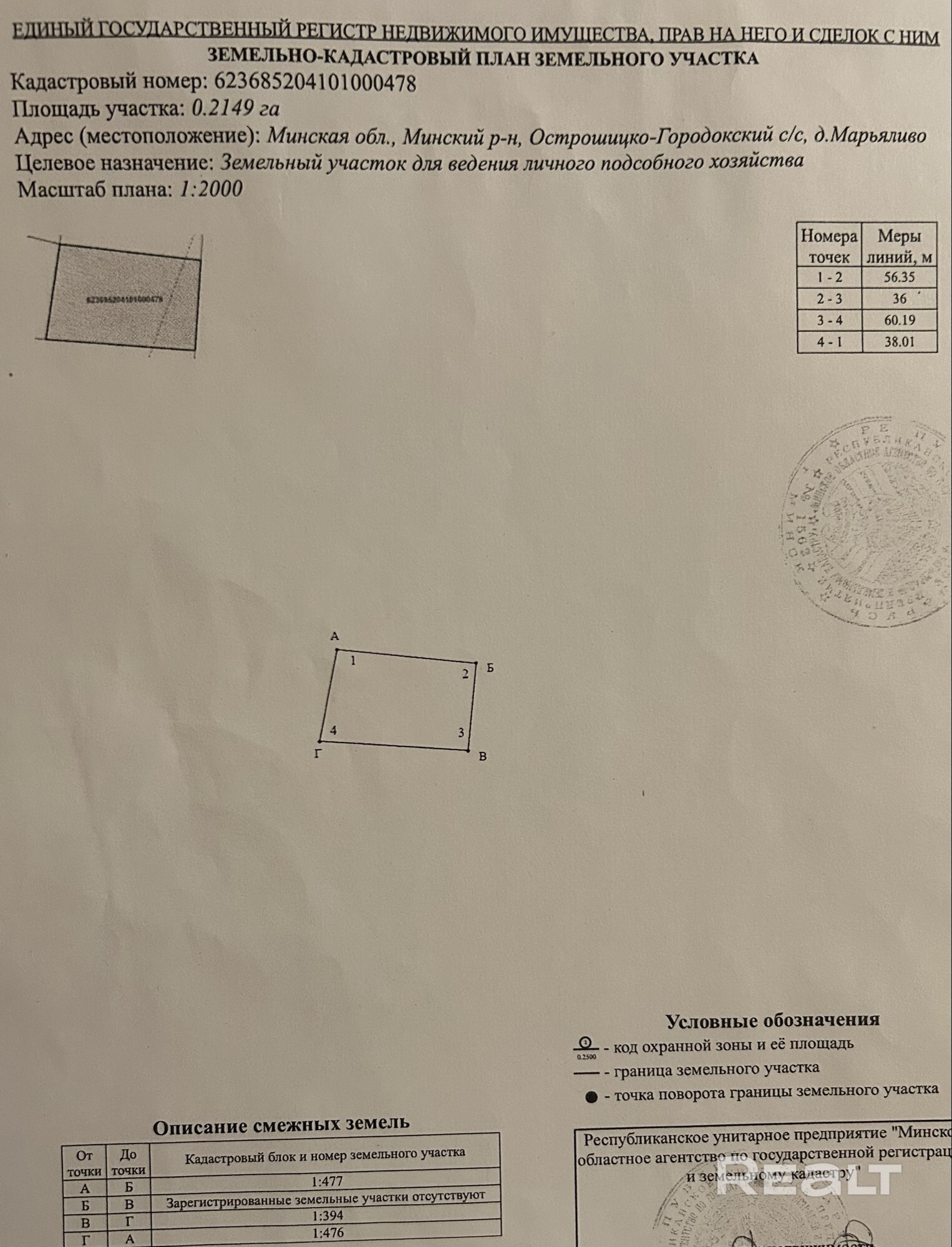 Продам земельный участок с кадастровым номером 623685204101000478. Координаты: 54.037743, 27.663186. Адрес объекта Минская обл., Минский р-н., Острошицко-Городокский с/с, д. Марьяливо. Участок находится рядом с домом по ул. Криничная, 29-А. Назначение - Земельный участок для ведения личного подсобного хозяйства. Участок правильной формы. Плюсы участка: Возможность смены целевого назначения. Живописная природа, тихая деревня, при этом - 10-15 минут до Минска. Рядом жилые дома, развитая коттеджная