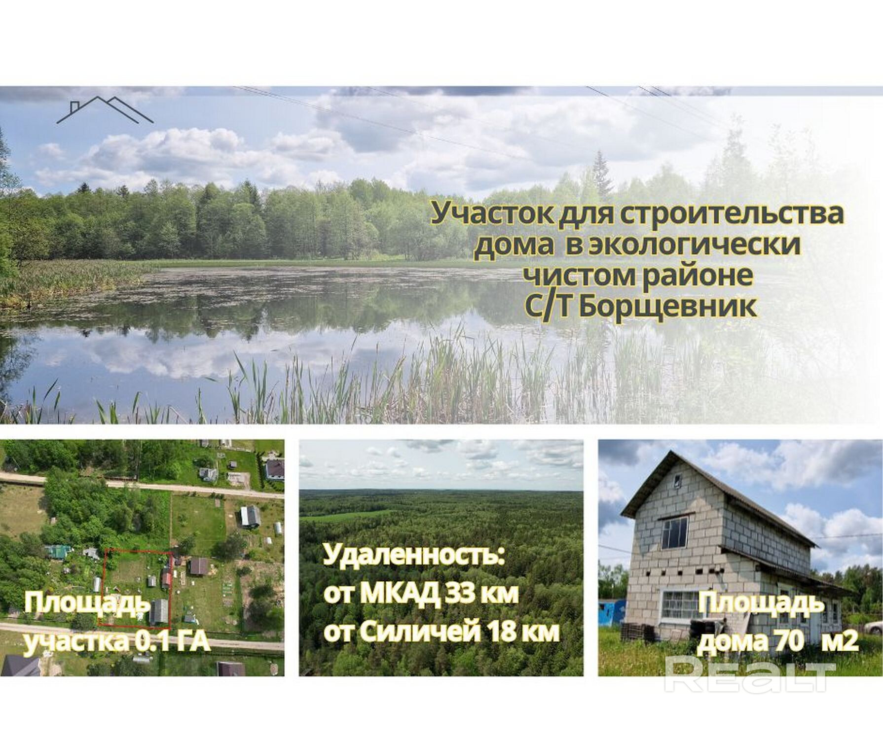 Продается ровный участок внутри щедрого леса!Продается дачный участок с домом в с/т Борщевник, Беларучского с/с, Логойского р/н, по Мядельскому направлению в 33 км от МКАД .Площадь участка 0,1 га, правильной квадратной формы, в горизонте – абсолютно ровный. Участок находится в живописном месте среди леса. Хорошие асфальтированные подъездные пути до с/т, по с/т – улучшенные грунтовые дороги. На участке расположено двухэтажное здание, беседка, хозяйственные постройки и элементы детской игровой инфраструктуры. Участок огорожен с трех сторон забором из сетки-рабицы.На участок и в дом введено электричество 220/380.Дом 2009 года постройки из газосиликатного блока. Общая площадь 73 кв.м. На первом этаже расположены: кухня, прихожая, комната. Имеется рабочая печь. Второй этаж представлен просторной комнатой. Все комнаты в жилом состоянии, возможен небольшой ремонт. Продается с мебелью.Кроме того, в летний период работает автолавка. Из г. Минска круглогодично курсирует автобус №353 до д. Прудище. Вблизи находится река Вяча. Недалеко горнолыжный центр Силичи и Раубичи. Чистая продажа.Конкурс. Быстрый выход на сделку!Звоните, чтобы узнать подробности и записаться на просмотр!
