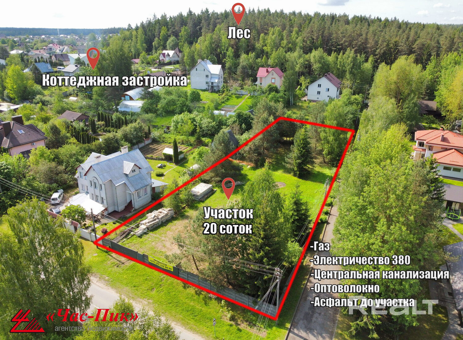 Жилая современная коттеджная застройка; все центральные коммуникации: свет 380, газ, центральный водопровод, центральная канализация, оптоволокно; возможность покупки второго смежного участка площадью 10 соток - в сумме 20 соток!