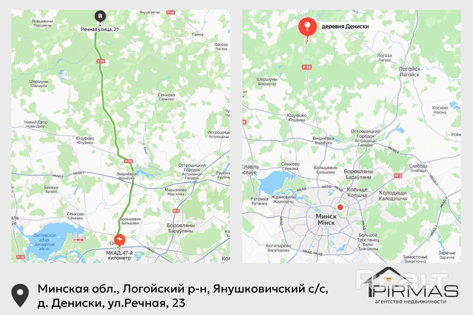 Деревня Дениски находится в Логойском районе, в 35 км от Минска, по Мядельскому направлению, трасса Р58. Время в пути на автомобиле — около 25 минут. Населённый пункт расположен рядом с трассой, при этом участок находится в стороне от дорожного шума. Остановка маршрутного такси и автобусов расположена в 2 минутах ходьбы. Обеспечено прямое транспортное сообщение с Минском.