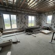 Объект создавался для себя, поэтому соблюдена логика строительства: несущие стены возведены полностью, межкомнатные перегородки готовы, но оставлен технологический зазор под разводку электрики — мелочь, а как упрощает жизнь!