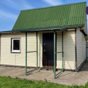 -Одноуровневый каркасно-деревянный домик с хозпристройкой. Размером 5,5 × 5,5 м.
