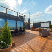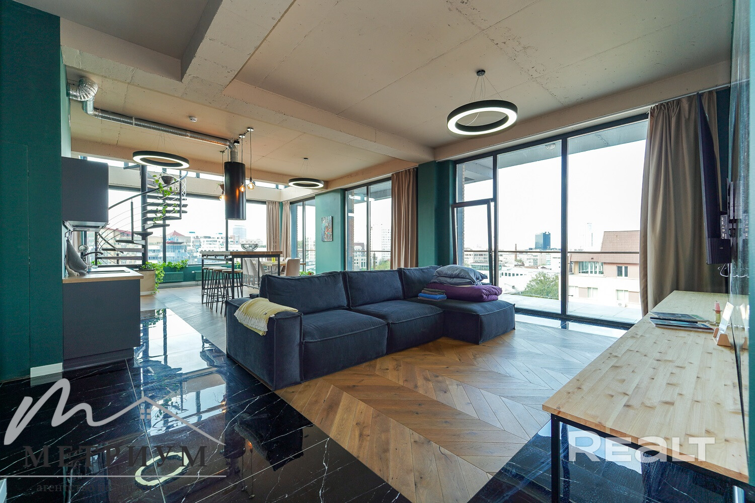 В здании современного БЦ, расположенного в центре столицы, на верхнем этаже продаются просторные апартаменты, оборудованные всем необходимым, с выходом на эксплуатируемую кровлю. Дизайнерский ремонт с использованием качественных дорогостоящих материалов, технологий и техники. Апартаменты состоят из кухни-гостиной 74,3м2, со вторым светом и винтовой лестницей на эксплуатируемую кровлю. В апартаментах 2 жилые комнаты (26,1 и 19,8м2), 2 санузла, гардеробная. Из всех комнат и гостиной есть выходы на террасу (37,8м2). Все стены вдоль террасы имеют панорамное остекление. Лестница из гостиной ведет на эксплуатируемую кровлю, где создана шикарная зона релакса. На большой огражденной террасе с озеленением площадью 142,3м2 имеется подиум с джакузи, большим экран с проектором, шезлонги и другая мебель для отдыха. В закрытом помещении с панорамным остеклением (43,6м2) расположена сауна, кухонная зона, есть душевая, туалет. С террасы открываются красивые виды. Хорошая инвестиция: апартаменты готовы для сдачи, как с целью проживания, так и проведения различных мероприятий.