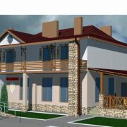 По проекту первый этаж - кафе , второй - комнаты для гостей, в цоколе - баня и фитнес-зал. Индивидуальный архитектурный проект выполнен с учётом данной местности и градостроительства курортного поселка Нарочь.