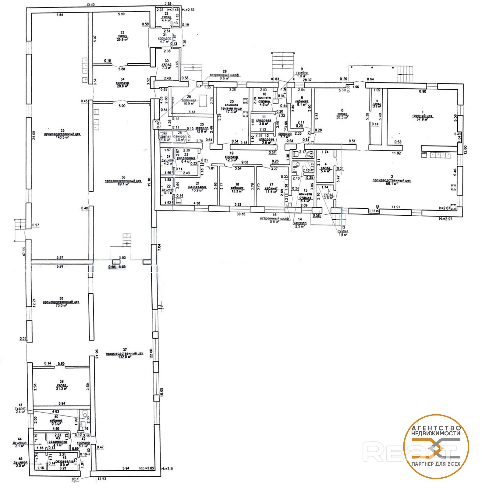 Здание состоит: 4 рабочих цеха + подсобные помещения (склад, столовая, кабинеты, душевая, санузел).
