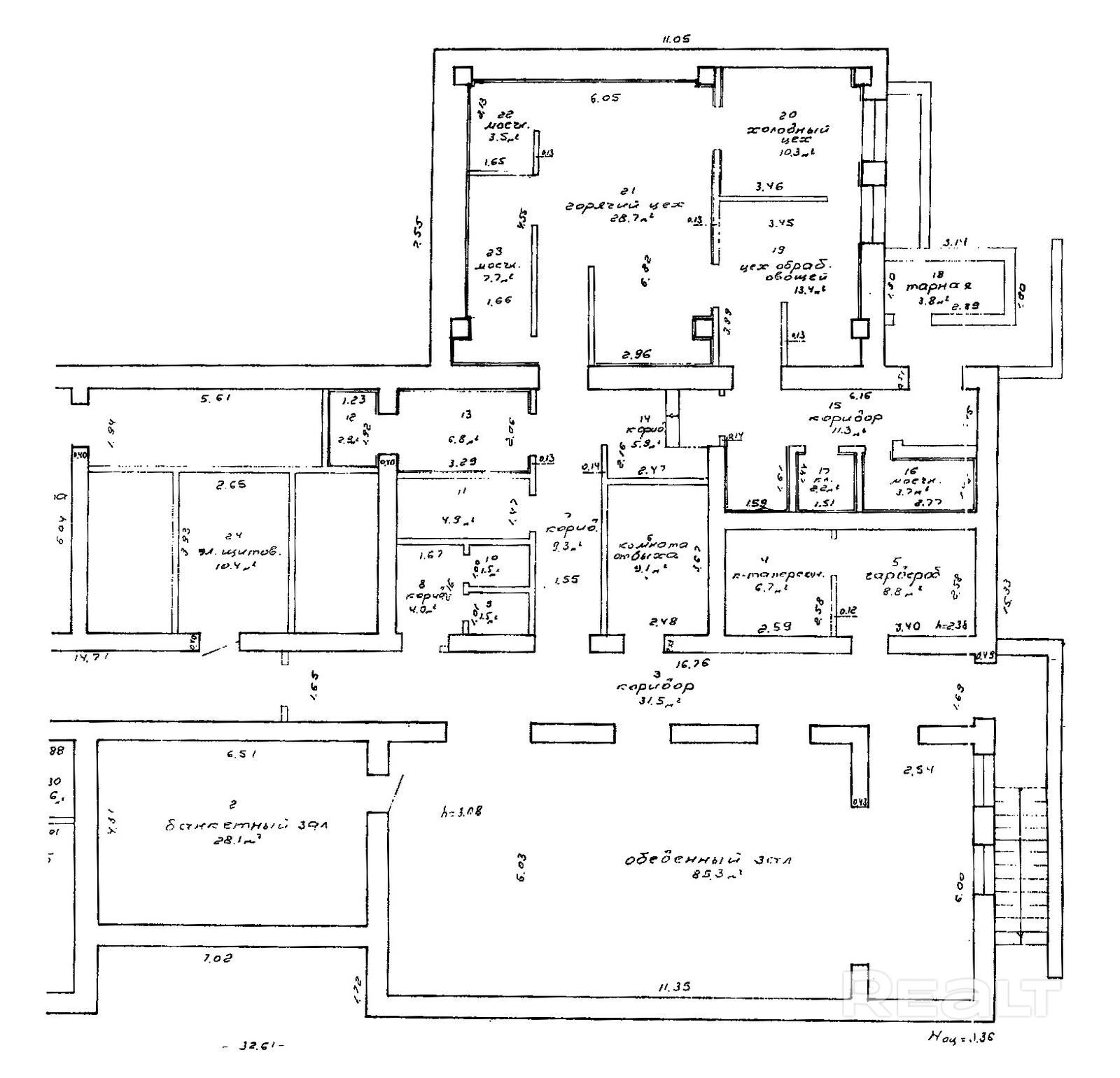 • помещение с ремонтом, высота обеденного зала - 3.08 м.;