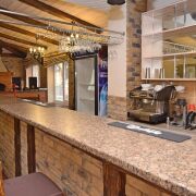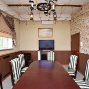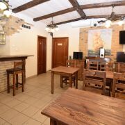 В кафе установлено барное, холодильное и кухонное оборудование, в том числе каменные печи для приготовления шашлыка, гриля и пиццы. Банкетные залы и общий зал меблированы и оснащены мультимедийным оборудованием. Есть возможность разместить летнюю террасу или беседку для отдыха на участке.