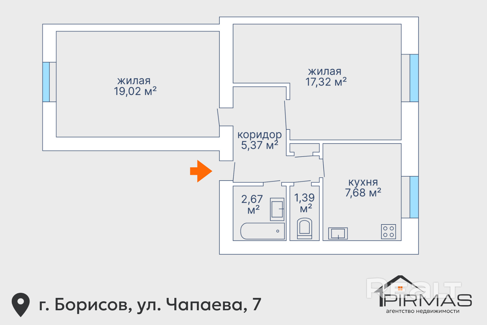 ► Комнаты — 19.02 м2 и 17.32 м2