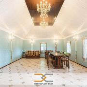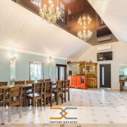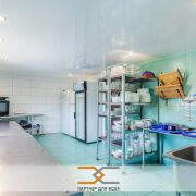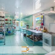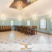- На первом этаже находится банкетный зал – 54,1кв.м., угловая летняя терраса застекленная двухкамерными стеклопакетами, площадью – 57,3 кв.м., кухня площадью – 25,4кв.м. с кухонным оборудованием (холодильники, газовая плита, столы кухонные, стеллажи) и 2 санузла. Есть возможность обогрева террасы тепло-пушкой для круглогодичного использования.