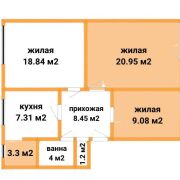 Продаются 2 комнаты в трехкомнатной квартире (62/100 доли, общая площадь 45 кв.м) по улице Центральной, 4 в г. Минске. Площадь комнат 20,95 и 9,08 метров квадратных.