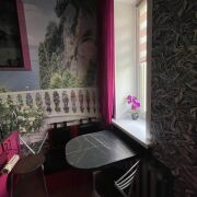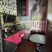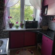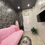 Кухня поделена на зоны. Есть своя зона с личным пространством со встроенной кухней. Потолок в ней натяжной, на полу ламинат.