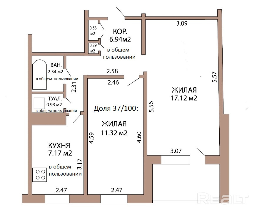 37/100 доли в квартире состоит из одной жилой комнаты площадью 11.32кв.м.