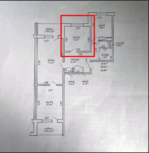 Продажа выделенной комнаты площадью 9м2 в трехкомнатной квартире площадью 62,82 м2.