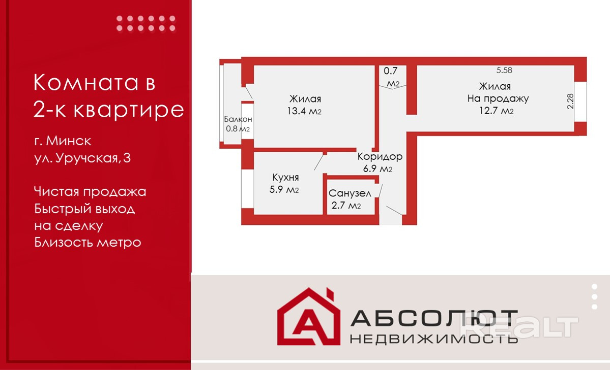 Продажа комнаты в 2-к квартире по ул. Уручская, 3
