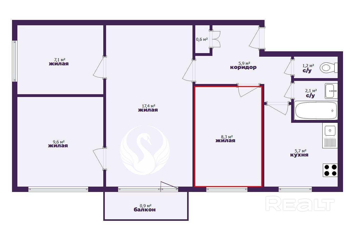 - Общая площадь квартиры составляет 58,5 кв.м., комната занимает 8,3 кв.м., а кухня - 5,7 кв.м.