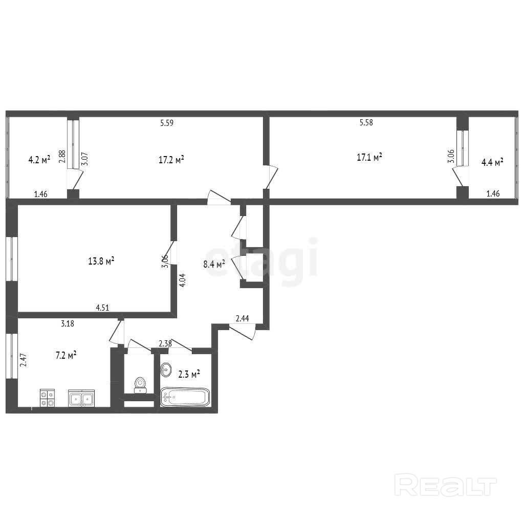 Общая площадь по СНБ 67,9 кв.м.. Высота потолков - 2,55 м.