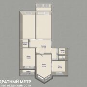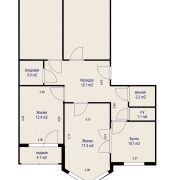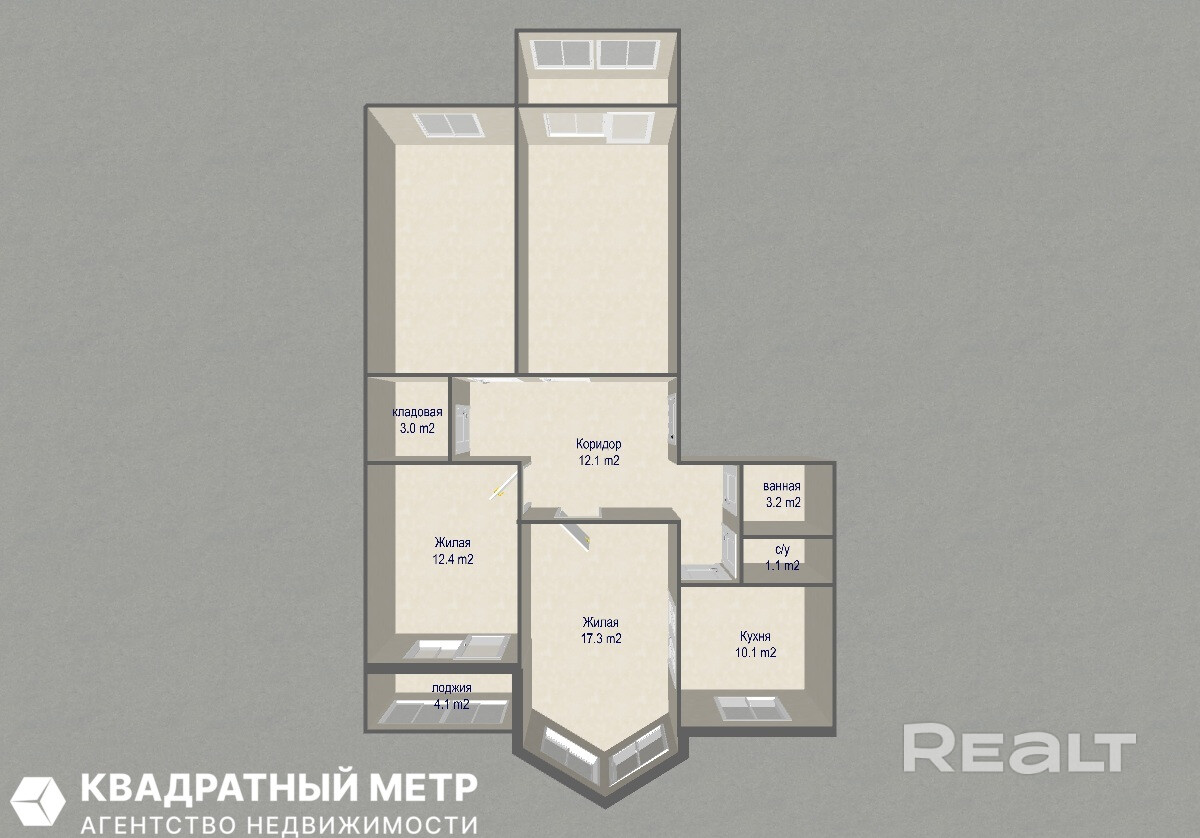 Площади: · Комната 1: 12,4 м2. · Комната 2: 17,3 м2. · Лоджия (при комнате 12,4 м2): 4,1 м2 — дополнительное полезное пространство.