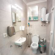 Ремонт внутри помещения выполнен в соответствии современными санитарными нормами. Цветовые решения – белый цвет как основной, светло-серый и бирюзовый. Применены керамическая плитка, сертифицированная краска для медицинских учреждений Condor Laubglanz, пластиковые медицинские двери выполнены по специальному заказу, медицинская мебель, раковины с антикоррозийным покрытием, дозаторы, салфетницы, электросушка.