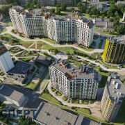 Вокруг густонаселенный район с многоэтажными домами.