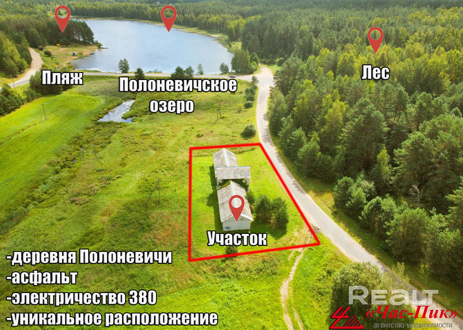Великолепный панорамный вид на водоём; застройка окружена сосновым лесом; отличная природа; рядом: свет 380; газ; оптоволокно; асфальт до участка; Брестское направление, Дзержинский район; лес, рыбалка, купание, грибы, ягоды, волшебное место для жизни и отдыха; чистейший воздух; все документы к продаже в соответствии с действующим законодательством РБ, фото с участка, отличные подъездные пути; премиум-класс; не упустите свой шанс приобрести "участок мечты"; приглашаем на просмотр! Торг.