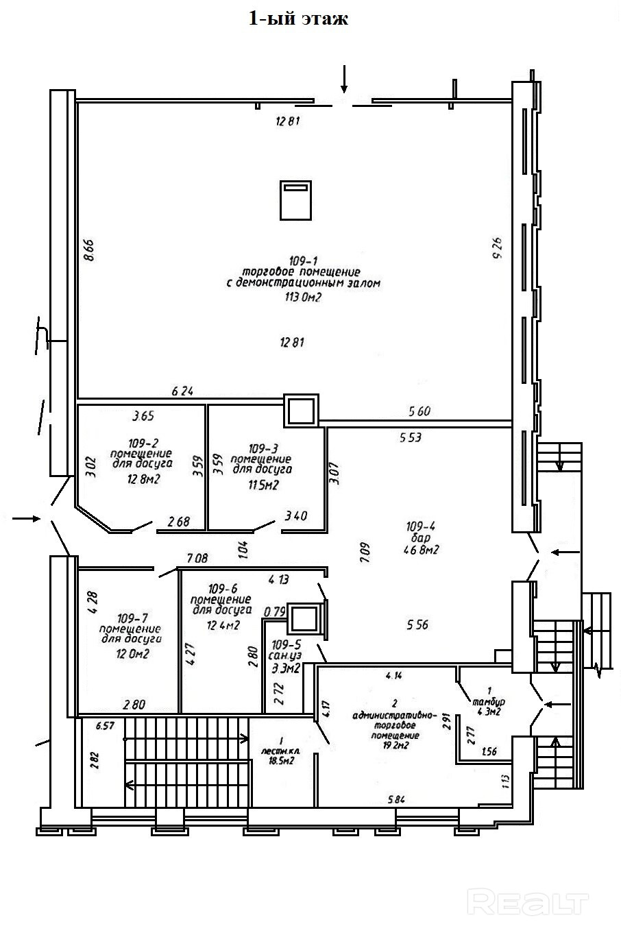 · цокольный этаж: 521 м2; с естественным освещением; пять отдельных входов- со всех сторон здания; высота потолков от 3 до 3.6 м