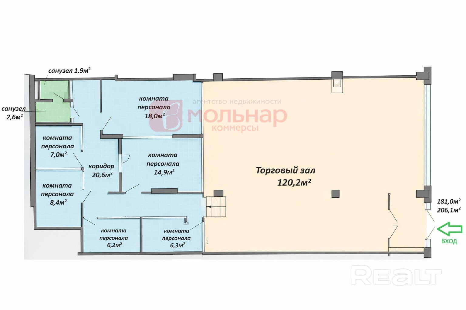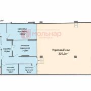 - Торговый зал — 120,2 м2, высота потолка 3,3 м